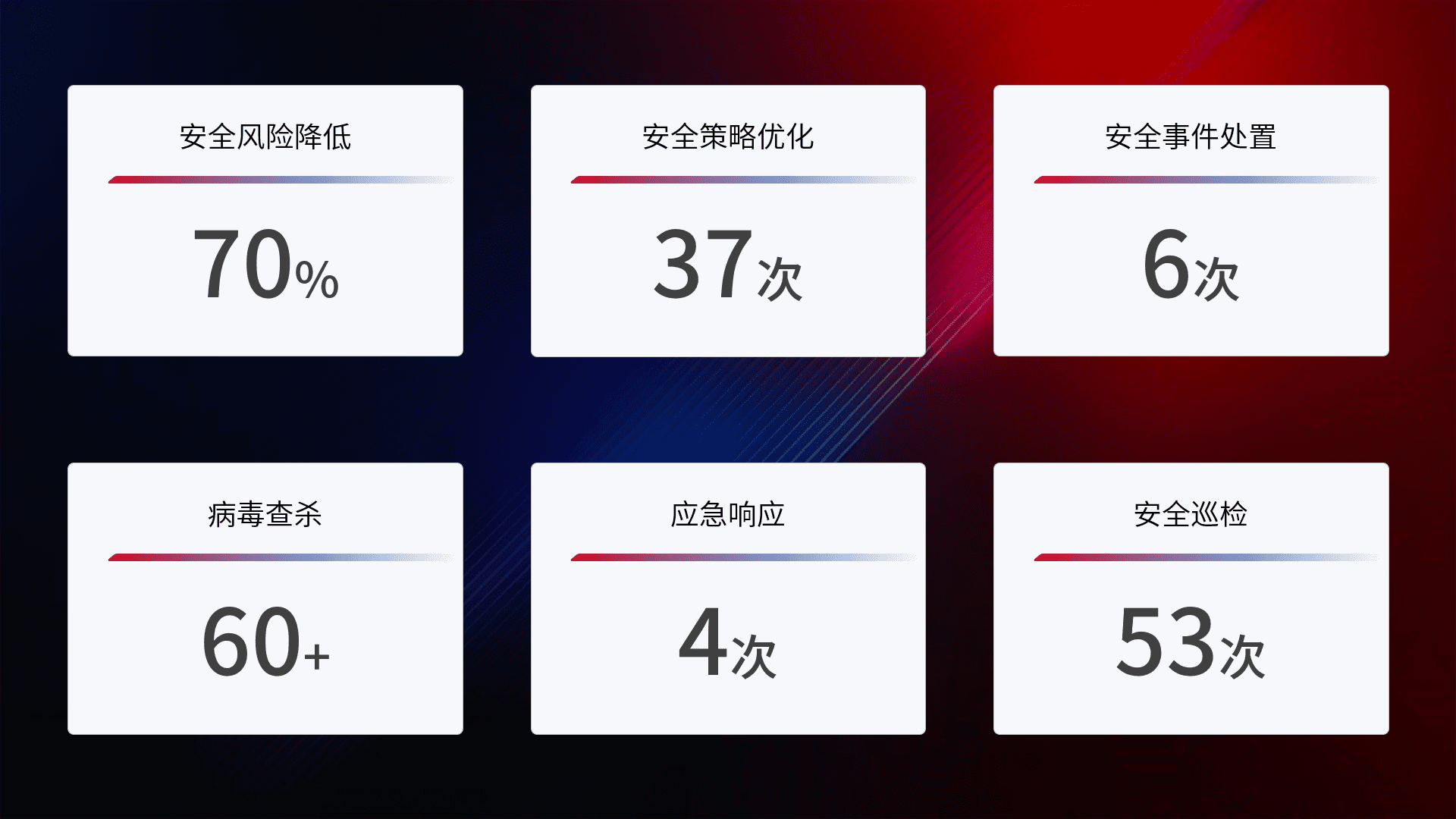 提供全面的安全事件报告体系,,,,包括处置报告、、周报、、、季度和年度总结,,,结合持续监控,,,帮助客户深入了解网络安全状况。。