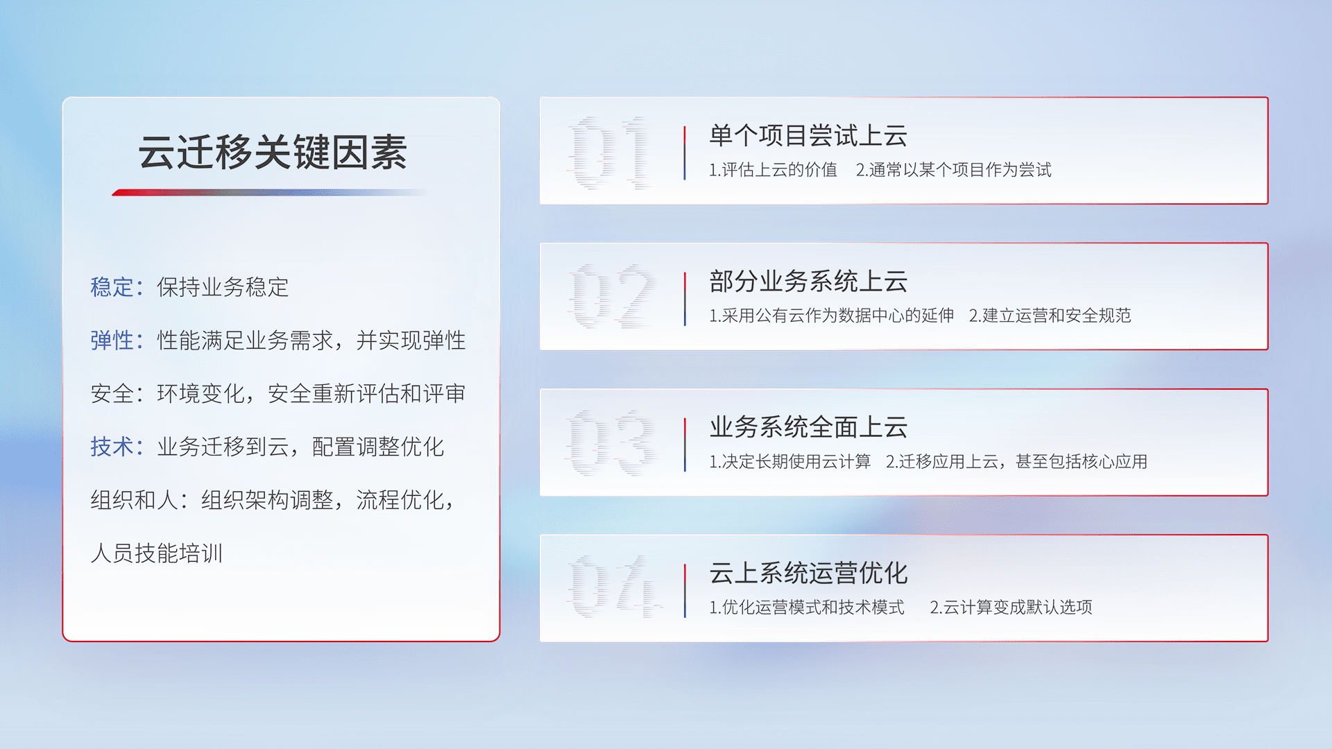结合实际业务,,从规划设计、、云平台选型、、、、云原生改造、、数据迁移、、、集成交付,,,迁移全过程为客户识别最佳上云路径,,,做好风险识别管理,,,,设计网络架构、、、身份权限、、、安全审计合规、、、、操作审计、、、日志审计、、、、监控告警策略、、、多站点容灾设计等,,对云上基础设施进行整体规划,,,提升IT治理水平,,,,以满足弹性、、、、高可用、、高性能的需求。。