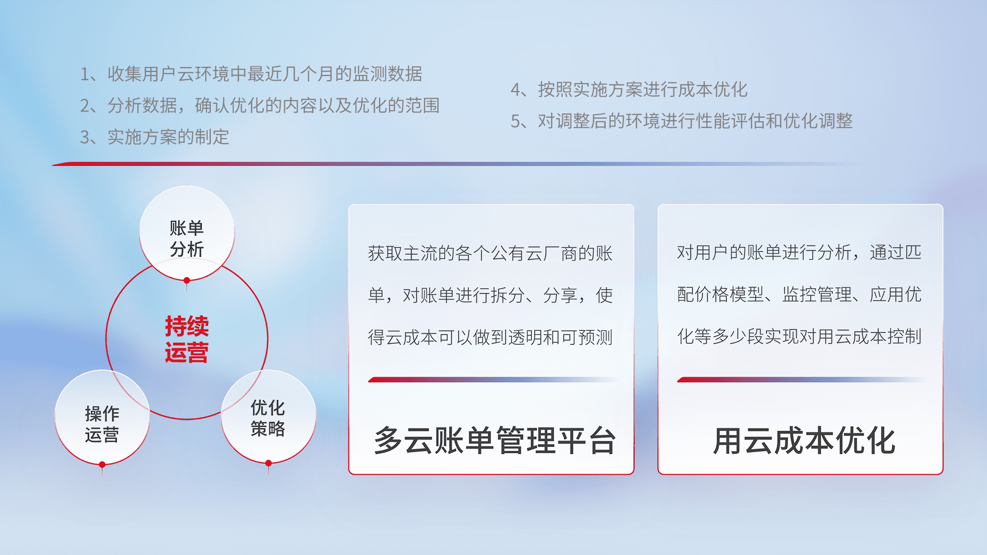 通过多云纳管,,,,以统一的资源数据模型把客户的云资源进行抽象和封装,,,进而实现对多云资源的统一操作,,,,保障云资源管理的可靠性、、、稳定性与可用性。。。。量身定制化运维内容,,,,配置、、开发运维、、、、补丁管理、、、备份、、、监控、、、认证和访问管理、、、审计和日常巡检等,,保障在用云过程中的可靠度,,,,稳定度以及高可用率。。